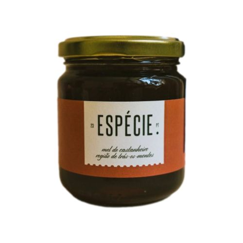 Frasco de mel de castanheiro com rótulo castanho e branco