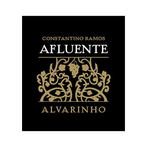 Garrafa de vinho branco Afluente Alvarinho com rótulo preto e detalhes dourados