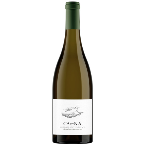 Garrafa de vinho branco CAE-RA com rótulo branco e rolha verde