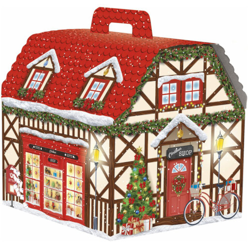 Caixa decorativa em forma de casa com tema natalício e detalhes coloridos