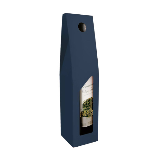 Embalagem azul escura para garrafa de vinho com janela e orifício circular para transporte