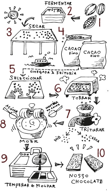 A escolha do cacau, torrefação, separação das cascas, moagem, refinação, temperamento e embalamento é realizada à mão, desde o grão de cacau cru até à tablete finalizada, em pequenas quantidades e tudo no mesmo local. Não só se obtém um chocolate que sabe bem mas também um chocolate que nos faz bem.