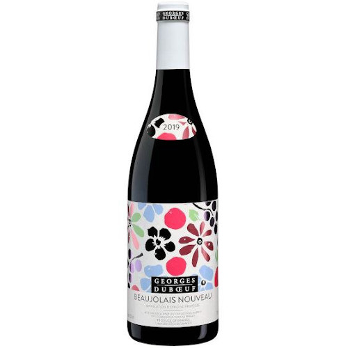 Garrafa de vinho tinto Georges Duboeuf Beaujolais Nouveau 2019 com rótulo colorido e tampa branca