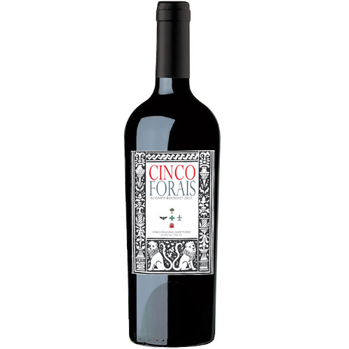Garrafa de vinho tinto Cinco Forais com rótulo branco e preto