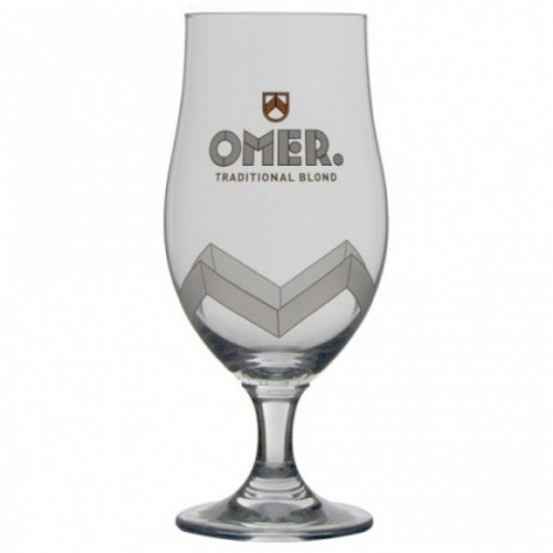 Copo de vidro transparente com texto 'OMER. TRADITIONAL BLOND' e padrão geométrico cinzento