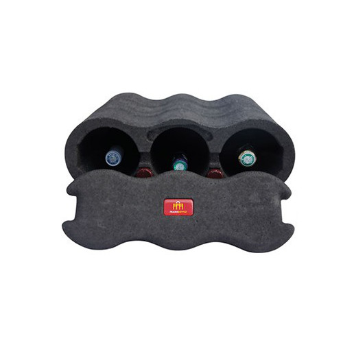 Suporte cinzento para garrafas de vinho com três garrafas e etiqueta vermelha