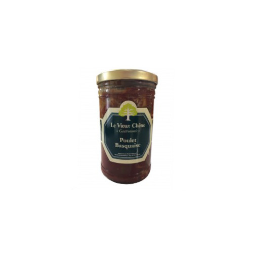 Ingredientes: Frango, Piperade 52% (tomates inteiros pelados e esmagados 40%, coulis de tomate 40%, ácido cítrico, pimentos verdes fatiados 11%, cebolas fatiadas 5,5%, açúcar, fécula de mandioca, sal, alho, aroma natural de pimento, especiarias, malagueta DOP Espelette 0,06%).