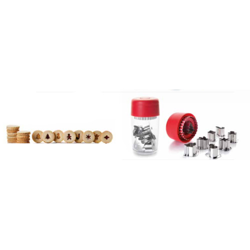 Conjunto de cortadores de massa com diferentes moldes e frasco de pequenos cortadores metálicos.