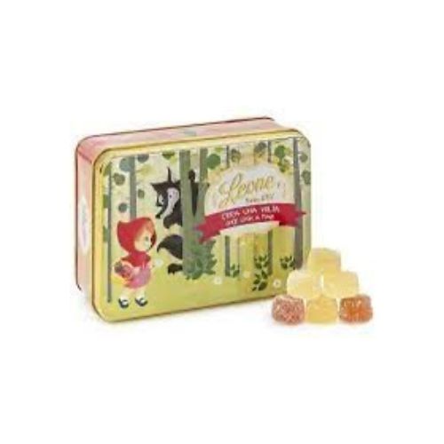 Lata decorativa com ilustração do Capuchinho Vermelho e balas coloridas fora da caixa