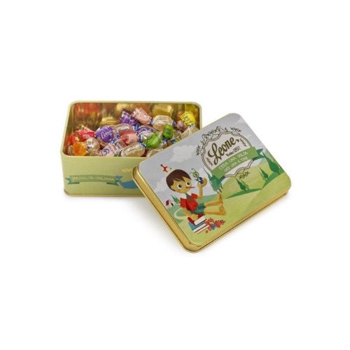Caixa metálica decorativa com ilustração e pastilhas coloridas