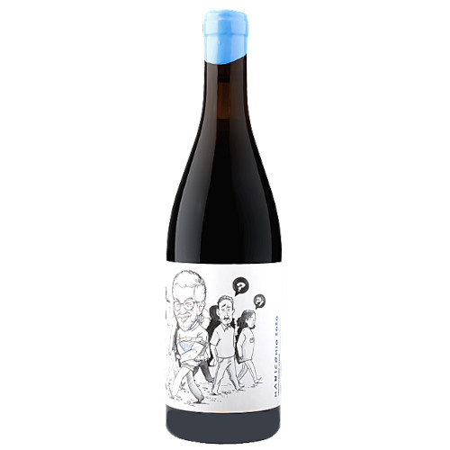 Garrafa de vinho com rótulo branco com caricaturas em fundo branco