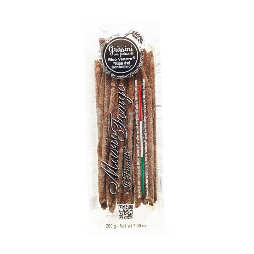 A farinha preciosa com que estes palitos de pão são produzidos é obtida através de uma moagem lenta que permite manter intactas as várias características organolépticas do arroz preto, tais como alta digestibilidade, riqueza em antioxidantes e alto valor nutritivo. O aroma do arroz preto confere um cheiro particular e único a estes preciosos palitos de pão.