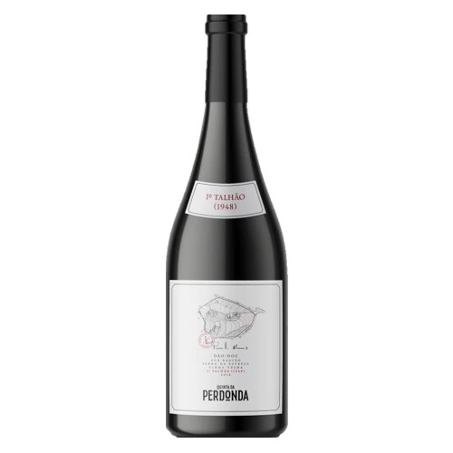 Garrafa de vinho tinto com rótulo branco e texto Nº TALHÃO (1948), PERDONA