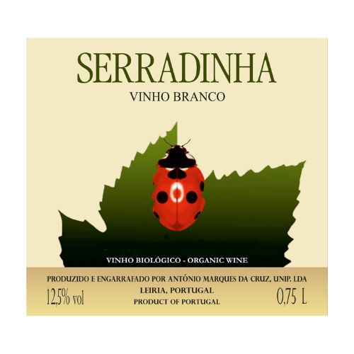 Etiqueta de vinho branco SERRADINHA com joaninha sobre folha verde
