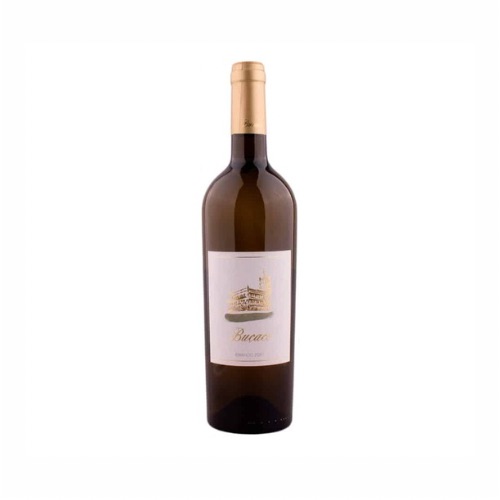 Garrafa de vinho branco com rótulo branco e texto Baco