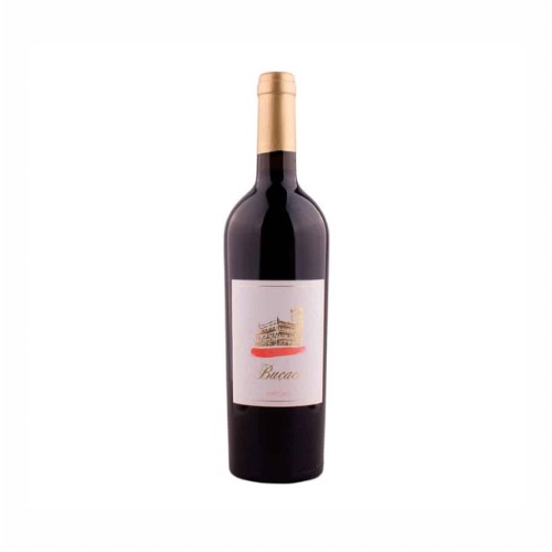 Garrafa de vinho tinto com rótulo branco com desenho de edifício e texto Bacco