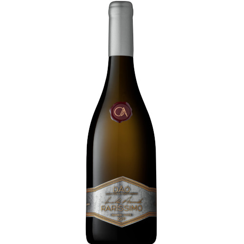 Garrafa de vinho branco Dão Raríssimo com rótulo cinza e selo vermelho