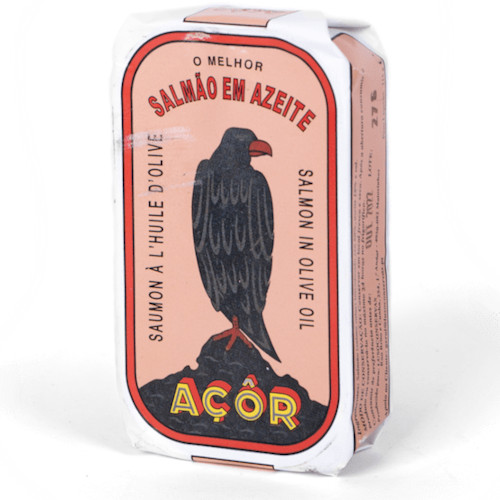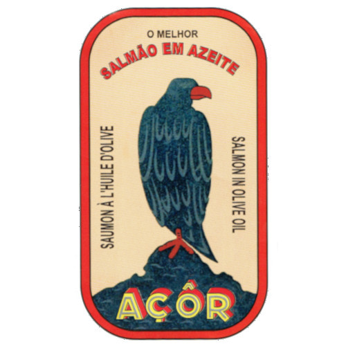 Embalagem de salmão em azeite com desenho de uma ave azul e texto em várias línguas.