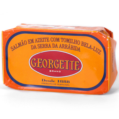 Lata de salmão em azeite Georgette, embalagem laranja com texto em português
