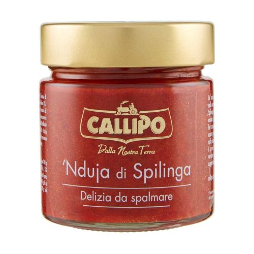 A Calábria 'Nduja de Spilinga Excelente para realçar o sabor dos primeiros pratos (entradas), sopas, pizzas e bruschetta, 'Nduja é uma das mais famosas, entre os produtos alimentares típicos da Calábria com um sabor absolutamente inconfundível. É um salame macio e barrável feito com carne de porco, um pouco de gordura e muita malagueta, levemente fumado antes de ser temperado por alguns meses. A verdadeira 'nduja original é da Spilinga, pronta a ser consumida num conveniente frasco reutiliável que permite evitar o desperdício e usá-lo sempre que quiser sem ter de fechar o intestino. Sabor muito picante e cor vermelha forte, é ideal para bruschetta ou na receita clássica de Fileja 'nduja. É também muito consumido em molhos e como condimento em pratos de carne.