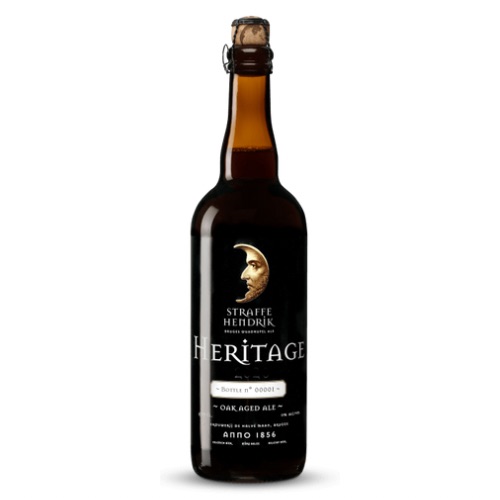 Garrafa de cerveja Straffe Hendrik Heritage com etiqueta preta e detalhes em branco e dourado