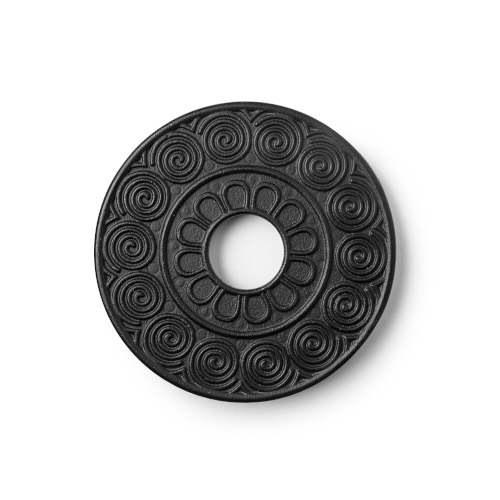 Base redonda preta em ferro fundido com padrão em espiral e três patas.