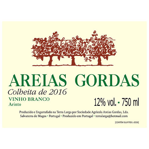Vinhos oriundos da Terra Larga, 15 ha de vinha em Salvaterra de Magos (mais 3 ha na Praia do Ribatejo), que é seguramente um dos terroirs mais versáteis de Portugal. Na Terra Larga, todos os anos olhamos para a vinha, e ao longo do ciclo vamo-nos inspirando sobre o que vai ser o seguinte Areias Gordas. Cada ano é um ano, e por isso cada colheita tem a sua composição e personalidade própria. Há um fio condutor nítido, mas cada uma proporciona sensações diferentes à prova. É também por isso que convivem ao mesmo tempo, não se anulando mas completando-se, diferentes colheitas e perfis de vinho saídos da mesma vinha. Cada um destes vinhos é uma interpretação com identidade própria do solo, clima, e castas que lhes deram origem. Dado o histórico da casa, podemos garantir, uma longa vida em garrafa, mas dá desde já uma bela prova e uma excelente integração gastronómica. Natural, é o vinagre, e apenas o mau. O vinho existe porque há intervenção humana. Fazer vinho é preservar, e se possível realçar, sempre sem deturpar, aquilo que a vinha nos dá. Natural é pois o vinagre. Mas se também só gosta de vinhos a saber a banana ou a compota de frutos vermelhos, não é aqui.