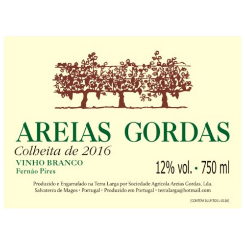 Vinhos oriundos da Terra Larga, 15 ha de vinha em Salvaterra de Magos (mais 3 ha na Praia do Ribatejo), que é seguramente um dos terroirs mais versáteis de Portugal. Na Terra Larga, todos os anos olhamos para a vinha, e ao longo do ciclo vamo-nos inspirando sobre o que vai ser o seguinte Areias Gordas. Cada ano é um ano, e por isso cada colheita tem a sua composição e personalidade própria. Há um fio condutor nítido, mas cada uma proporciona sensações diferentes à prova. É também por isso que convivem ao mesmo tempo, não se anulando mas completando-se, diferentes colheitas e perfis de vinho saídos da mesma vinha. Cada um destes vinhos é uma interpretação com identidade própria do solo, clima, e castas que lhes deram origem. Dado o histórico da casa, podemos garantir, uma longa vida em garrafa, mas dá desde já uma bela prova e uma excelente integração gastronómica. Natural, é o vinagre, e apenas o mau. O vinho existe porque há intervenção humana. Fazer vinho é preservar, e se possível realçar, sempre sem deturpar, aquilo que a vinha nos dá. Natural é pois o vinagre. Mas se também só gosta de vinhos a saber a banana ou a compota de frutos vermelhos, não é aqui.
